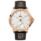 · 2025Cal. 617: 171 Teile, vollständig von Hand montiert, Handaufzug. Eine hausintern geformte Breguet-Spirale. Sechs-Lagen-Regulierung — der Standard sind fünf. Für 2025 erscheint die Patria erstmals in Titan Grad 5: leichter als Stahl, warm auf der Haut.