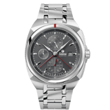Der Chronograph hat einen zentralen Minutenzeiger — einen Zeiger, der von der Mitte des Zifferblatts aus läuft, wie der reguläre Minutenzeiger.