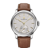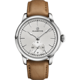 · 2025Caliber 617: 171 parts, assembled entirely by hand, hand-wound. A Breguet overcoil shaped in-house. Six-position regulation — the standard is five. For 2025, the Patria arrives in grade 5 titanium for the first time: lighter than steel, warm against the skin.
